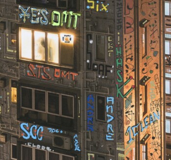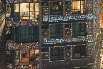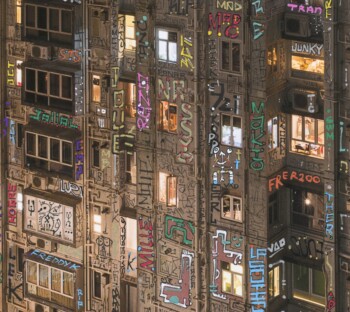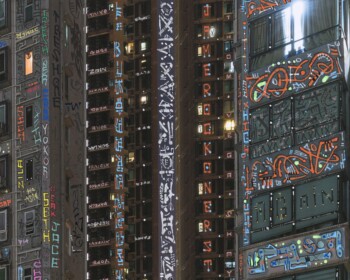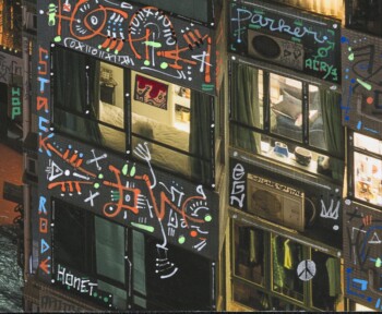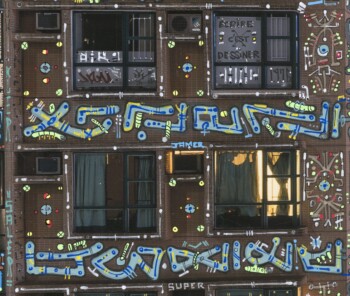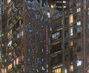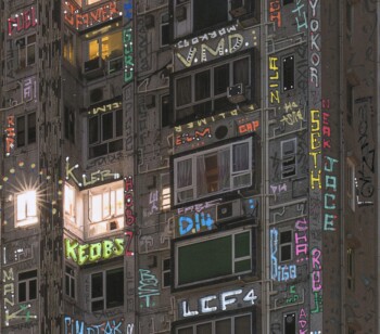 Si seulement mon œuvre pouvait alerter sur leur condition de « détention » : le terme n’est pas trop fort quand beaucoup vivent dans des pièces plus petites que des cellules de Fleury-Mérogis. En attendant que la matrice soit virussée et détruite, que tout s’écroule, que la terre avale notre cupidité morbide, on la sublime, avec l’art comme étendard. Les tags, vu comme un symbole du sale et du vandalisme par une société hygiéniste, font scintiller ici un panorama urbain sombre et extrême.