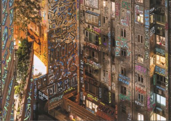 Je contemple le panorama sans être totalement satisfait. Certains tags font 2 ou 3 mm mais il reste toujours une place inoccupée pour un nouveau tagueur. Je creuse toujours plus loin dans mes souvenirs, je suis à Hong Kong, en même temps je suis poursuivi par 50 lascars sur la petite ceinture, happé par un souvenir bien réel qui reprend vie à l’évocation d’un blaze de mon équipe proche : bugz. Katre se fait chasser par un berger allemand dans une friche de nuit dans notre quartier du 14ème arrondissement, Seth se cache sous une voiture pendant des heures pour échapper à la bac du 92, Rare se fait marcher dessus par un GPSR (milice du métro)… Autant d’histoires qu’il y a de blazes dans cette photo. Je suis le « Blaze runner ».