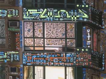 Le graffiti est toujours venu chatouiller ce consensus de la propriété privée, créatrice d’une société hyper-inégalitaire. On tague ou on veut, quand on veut, en essayant de pas se faire griller. Généralement, on le fait jusqu’à ce qu’on finisse en garde à vue, condamné à payer des sommes à 5 chiffres. Beaucoup de proches sont tombés en 2001, lors du procès de Versailles, devenus insolvables à vie, interdits d’accéder à un quelconque crédit qui leur permettrait de s’endetter à vie… pour devenir propriétaires. En customisant cette photo, j’évite les balances, les postes de police et les tribunaux, les frais d’avocat, les courses poursuites mais aussi nos chers shoots d’adrénaline. Omnipotent, toutes mes journées sont dédiées à peindre ce bloc d’immeubles triste, centimètre carré par centimètre carré, du rez-de-chaussée jusqu’aux toits, le graffiti s’infiltre partout comme un virus. J’utilise toutes les couleurs, toutes les marques de markers, tout y passe. Je n’ai pas compté le nombre de couleurs employé mais je n’égalerai jamais ce record