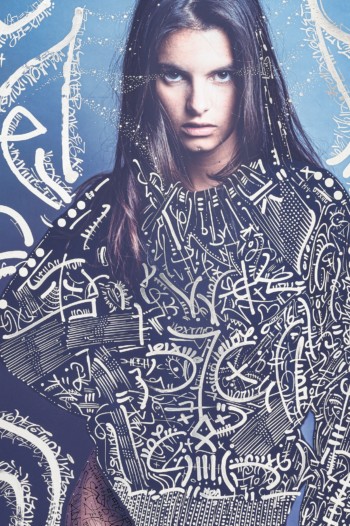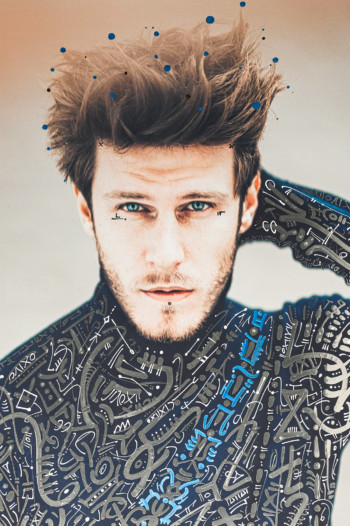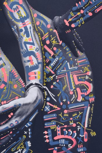 Le tracé n’est pas automatique : il écoute les courbes des modèles, leur répond à coup de symboles ou de chiffres, parfois magiques. Jérôme offre aux corps de Fabrice une armure alphanumérique indestructible : sa densité, ses contours et ses pulsations singulières signent et protègent chaque oeuvre sensuelle. La fusion est totale.