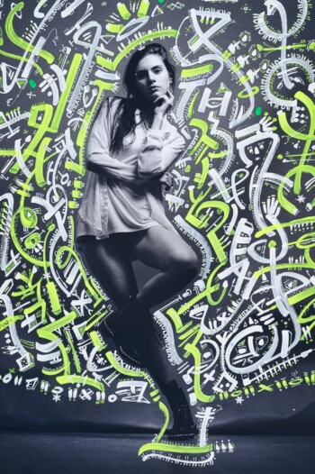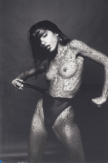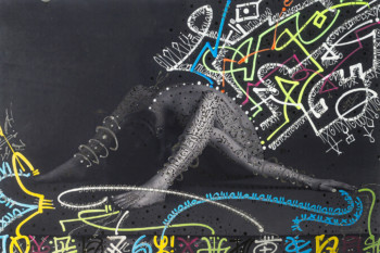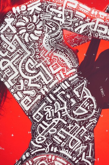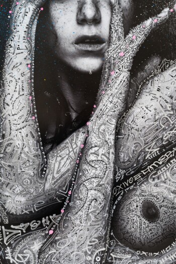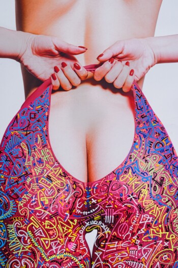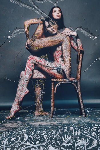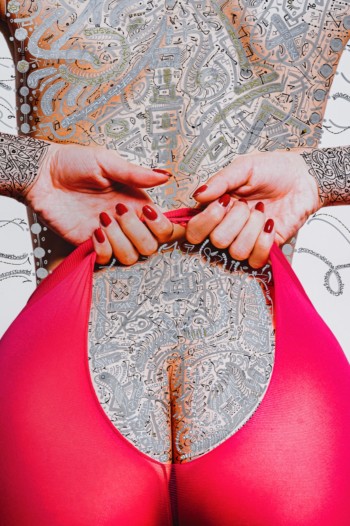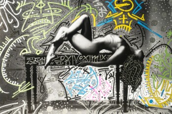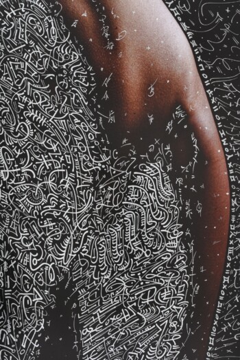 La collaboration entre Jérôme et Fabrice tisse un dialogue sans filet entre deux disciplines : la photographie et le graffiti. Sont exhibés des corps saturés de signes – linguistiques, numériques, ésotériques – qu’il faudra minutieusement décoder pour lire les univers de chair.