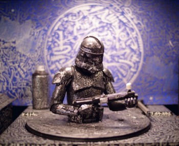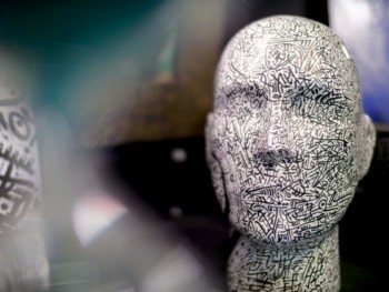 A black box to bring a halt to Time’s progress. And stop as well the creative frenzy which led Jerome Thomas, a graffiti, rap music and video hybrid, to produce objects and canvases currently available for show, with feeling. His Ivry-based art workshop has mutated into an immersive exhibition of a space vessel whose flight has been suspended. Amongst the 55 art pieces achieved over the past three months, some twenty dictated their own scenography to the Time Gambler, the artist’s avatar. The energy conveyed by this space opera is faster than sound, light, matter, or sensation, all combined to induce an experience. Invasive all-over-the-place calligraphic signs, JT’s urban signature, have come to cohabit with larger format paintings performed by spinning ; a new way of hallucinating the visitor’s eye. Some figures, some monsters take shape where trance and technics merged. The primitive symbol speaks to the random one, move echoes matter, the vandal lends colour to the the cyberpunk, chemistry gets rough with magic ; the eye makes it all.