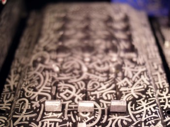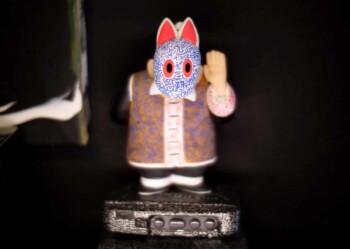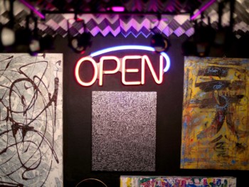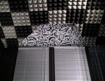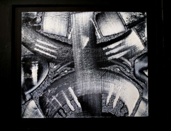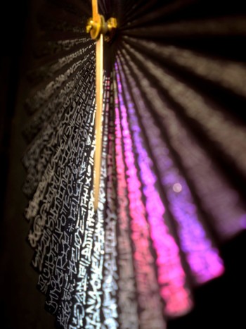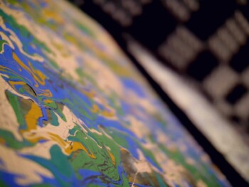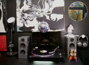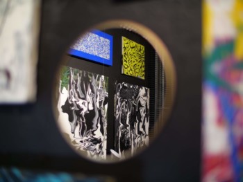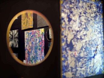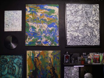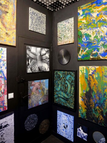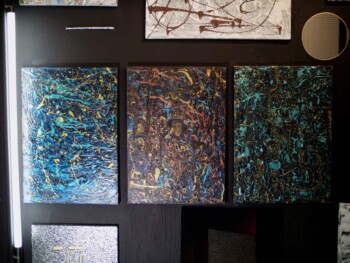 Parmi les 55 œuvres accomplies au cours des trois derniers mois, une vingtaine ont dicté leur scénographie au joueur du temps, avatar de l’artiste. Un space opera qui concentre une énergie plus rapide que la lumière, le son, la matière, ou la sensation, tous convoqués pour faire expérience. On retrouve l’envahissement des signes calligraphiques sur toutes surfaces, signature urbaine de JT, mais ils cohabitent désormais avec des toiles grand format réalisées par spinning art, qui hallucinent encore autrement l’œil du visiteur. Des figures ou des monstres s’y détachent, là où la technique et la transe ont fusionné. Le symbole primitif parle à l’aléatoire, le geste répond à la matière, le vandale prête sa couleur au cyber, la chimie se prend la tête avec la magie ; le regard fait (tout) le reste.
